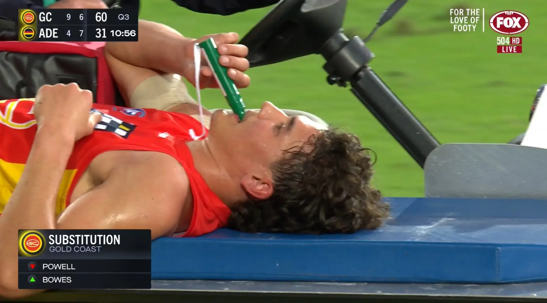 Halfway through the third quarter in the clash between the Gold Coast Suns and Adelaide Crows, 22-year-old Powell was tackled mid-air by Ned McHenry.