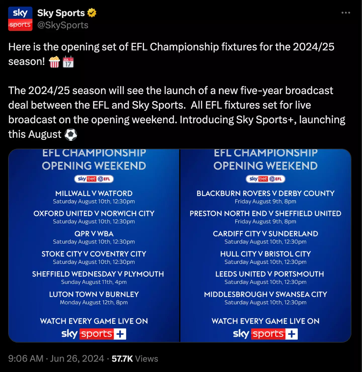 In fact, every EFL game from the opening weekend is live on TV, and will be shown on the new Sky Sports+ channel.