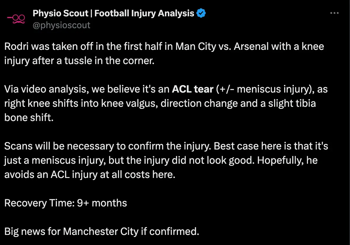 A football injury expert has dropped a worrying verdict on the knee injury suffered by Manchester City star Rodri in his side's 2-2 draw against Arsenal.