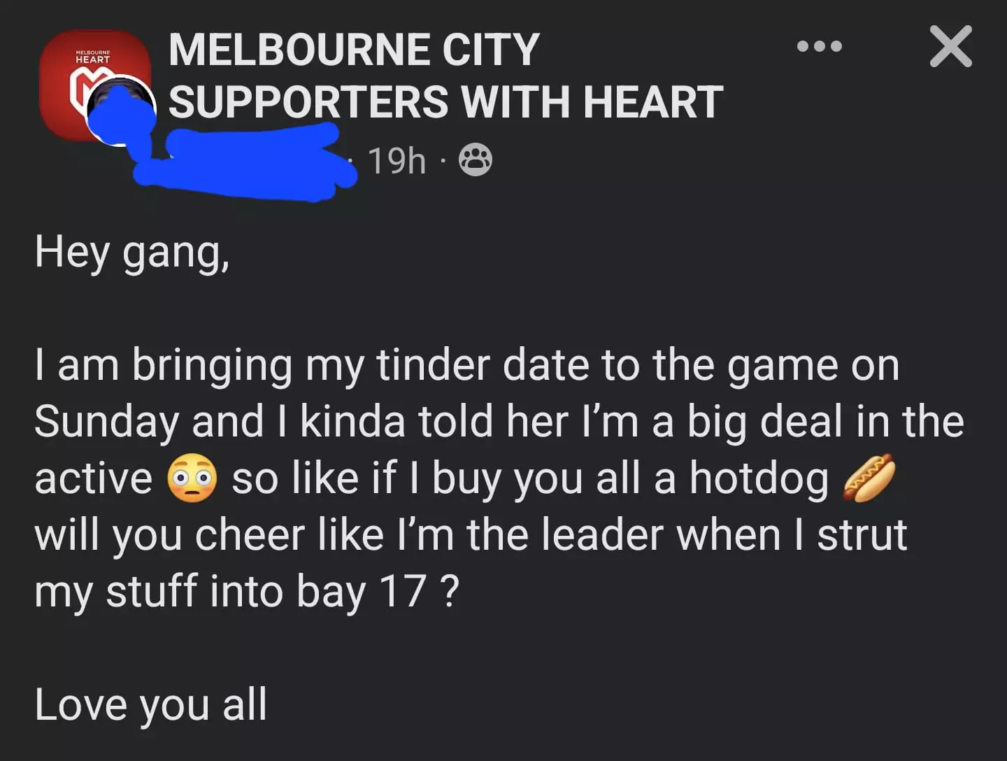 In a Facebook post to the City page ‘Melbourne CIty supporters with heart,’ he made the daring ask.