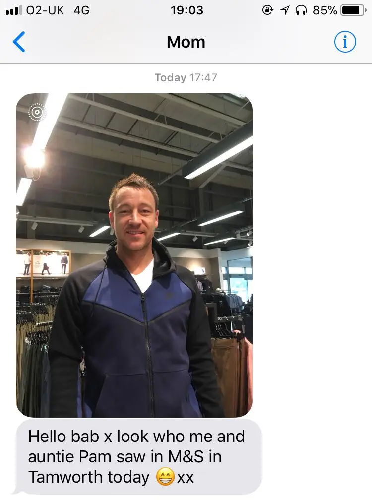 She wrote: "My mom and auntie saw John Terry whilst shopping, asked him for a photo and just straight up took a picture of him on his own...DYING."