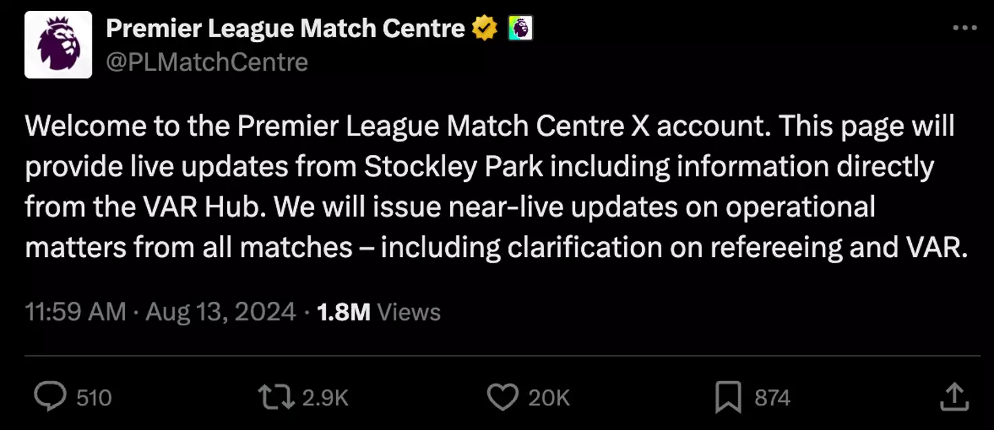 The Match Centre is a new social media account on Twitter, which the Premier League says will provide 'near-live explainers and updates on operational and officiating matters for every Premier League match'.