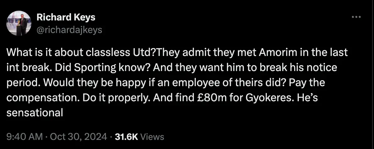 Richard Keys has criticised Manchester United over their approach of Sporting Lisbon manager Ruben Amorim.
