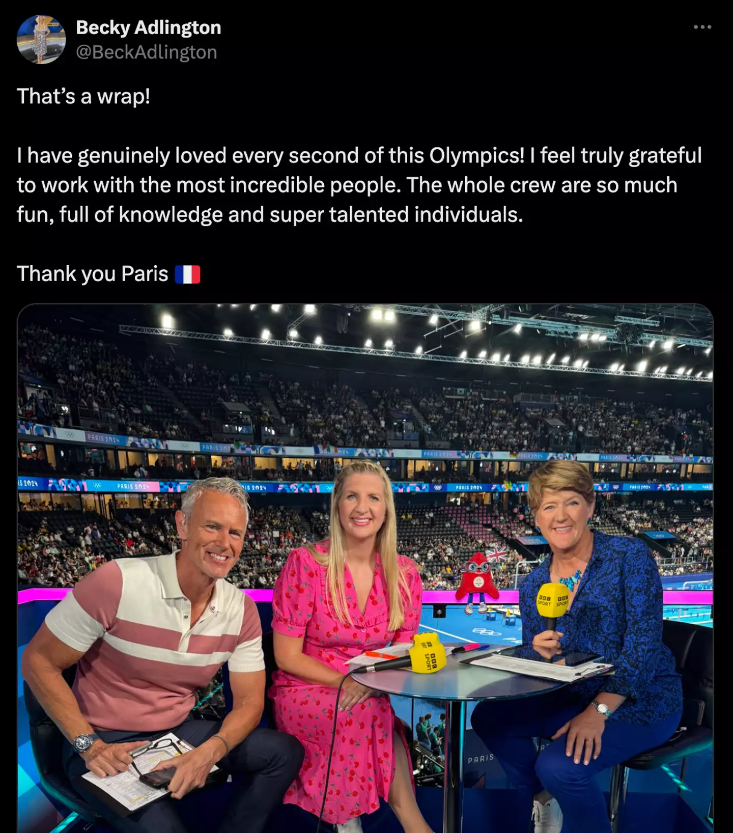 Adlington has now taken to Twitter to confirm that, following the conclusion of the swimming schedule, her punditry duties at the Games are now over.