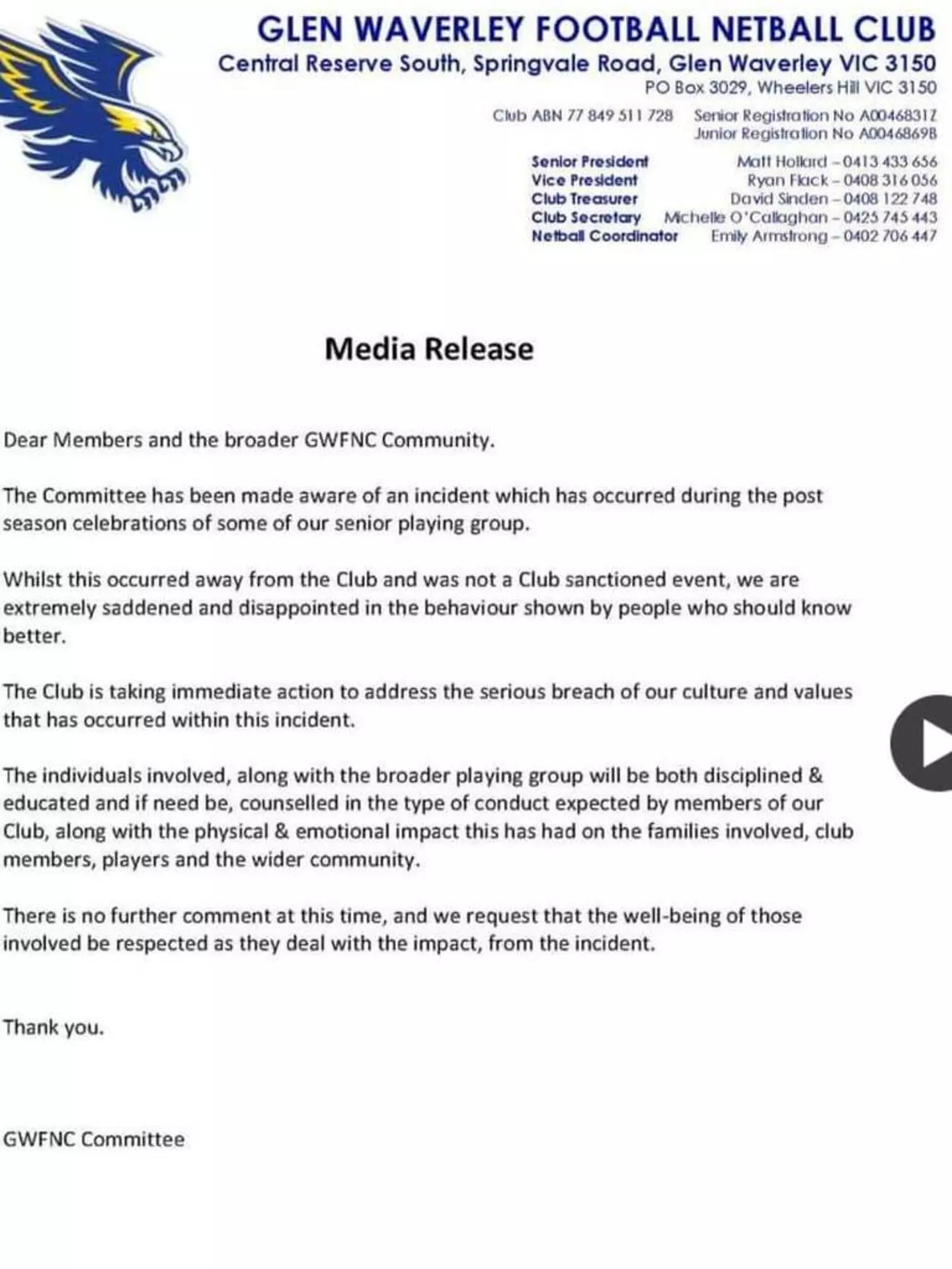 The Glen Waverley Football Club has been forced to release a statement following the viral incident, saying they are "extremely saddened and disappointed in the behaviour".