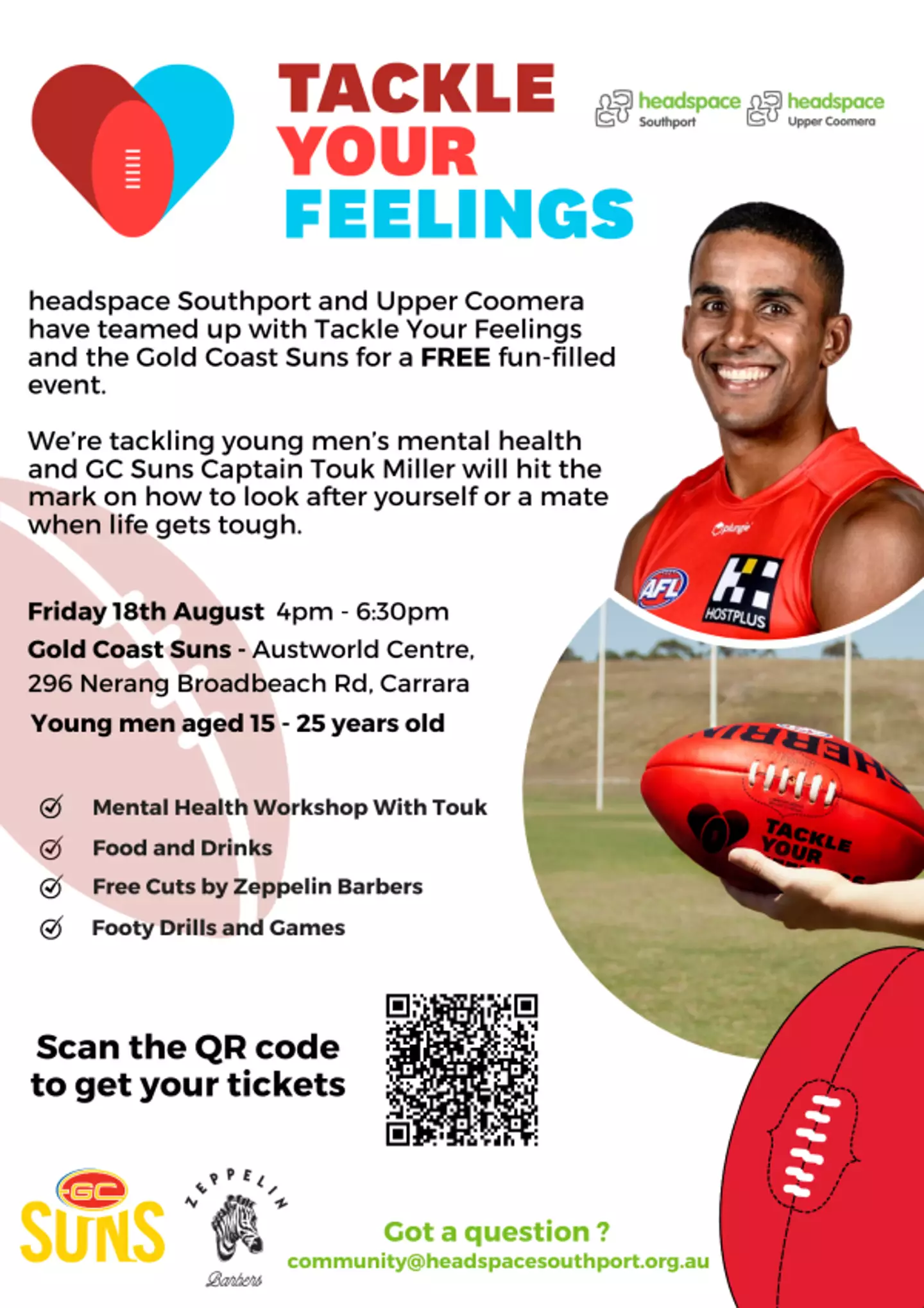 The headspace team has linked up with Tackle Your Feelings, which is a mental health education program for community AFL clubs, as well as the Gold Coast Suns.
