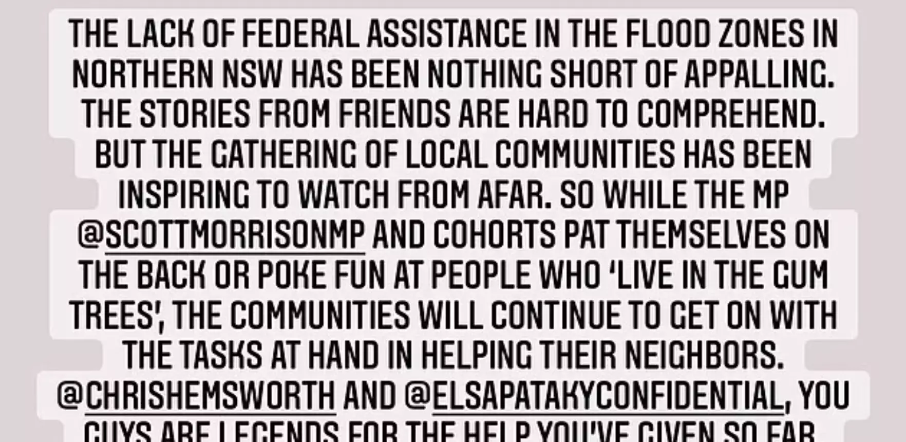 "The lack of federal assistance in the flood zones in northern NSW has been nothing short of appalling. The stories from friends are hard to comprehend," Slater wrote on his Instagram.