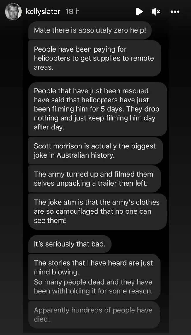 But a bunch of people haven't been too pleased with the federal government's overall response to the disaster - 11-time surfing world champion Slater being one of them.