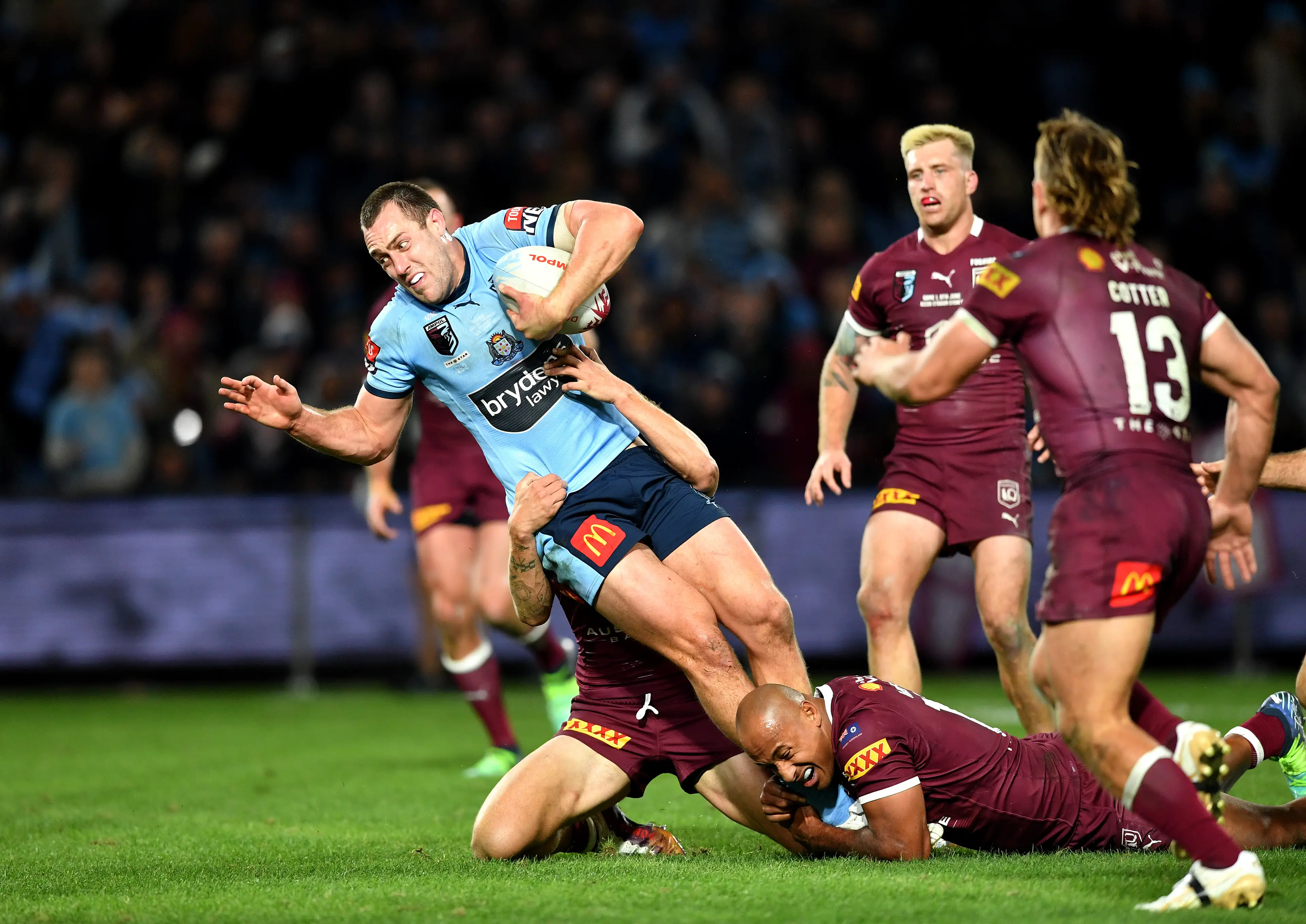 The game remained a real arm wrestle in the first half, and when Xavier Coates left the field with a leg injury, the Maroon were down to 16 men. It seemed the Blues may get the upper hand. But when Harry Grant and Carrigan came off the bench in the 22nd minute, the Maroons seemed to lift. Grant was superb out of dummy half, and Carrigan joined the rest of the Qld pack and kept inflicting the pain. Despite being behind on the scoreboard, the momentum seemed to be with the visitors.