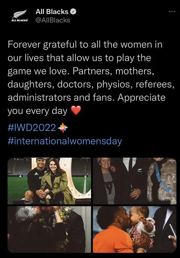 "NZR and our Teams in Black celebrated International Women's Day across all of our digital channels and our intent was to portray the many roles women have in our game," a New Zealand Rugby spokesperson said.