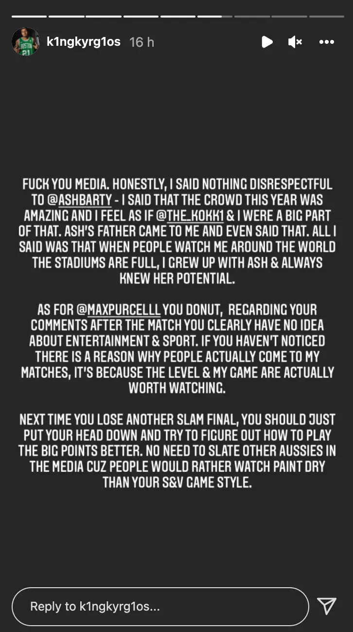 "Honestly, I said nothing disrespectful to @ashbarty - I said that the crowd this year was amazing and I feel as if @the_kokk1 and I were a big part of that.