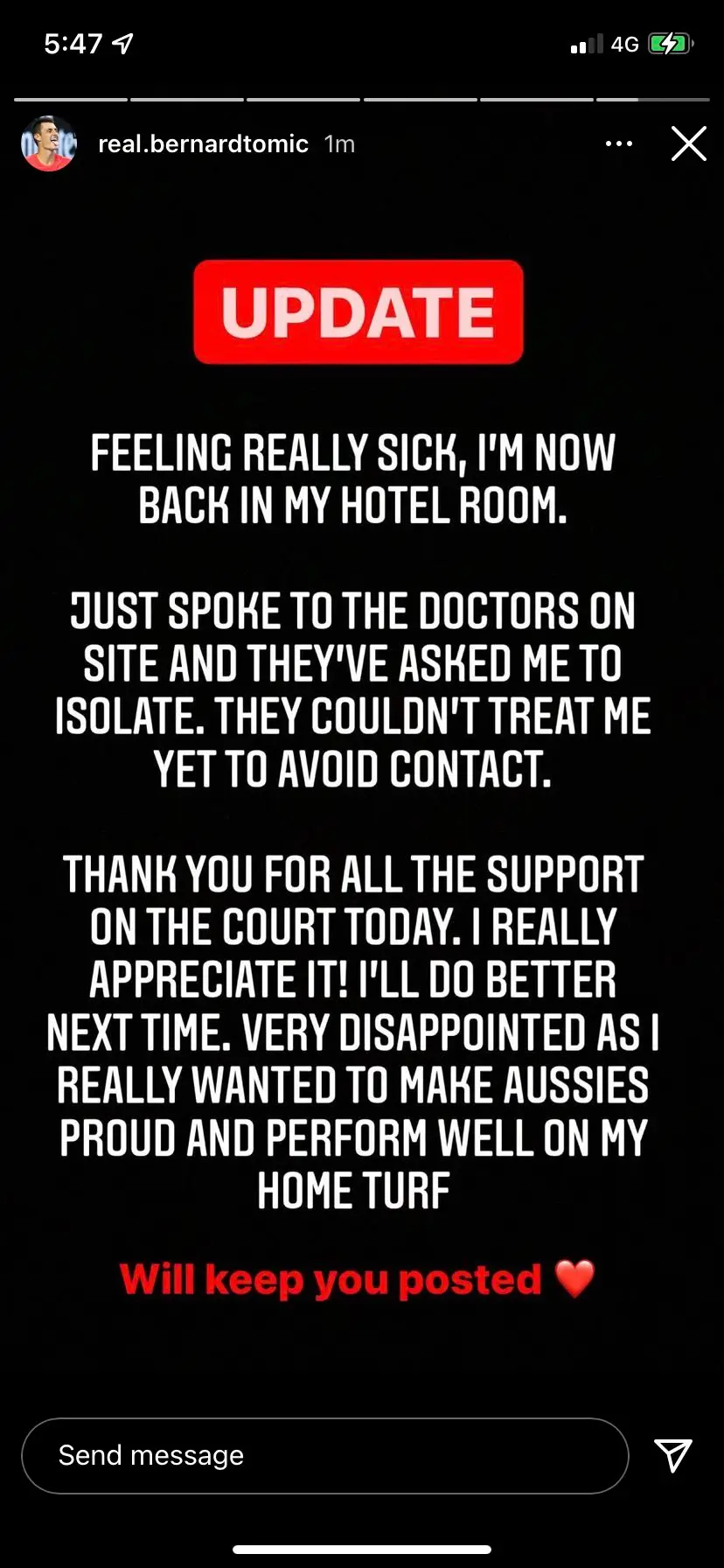 Tomic was competing in the qualifying stage of the Australian Open, falling short in the second round against Russian opponent Roman Safiullin.