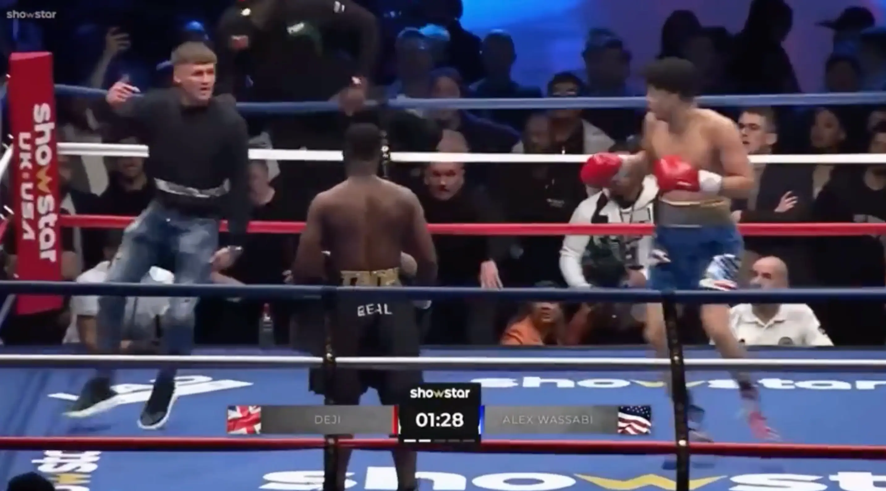 The YouTube boxing clash between rivals Deji Olatunji and Alex Wassabi was shockingly interrupted after a fan stormed into the ring on Saturday.