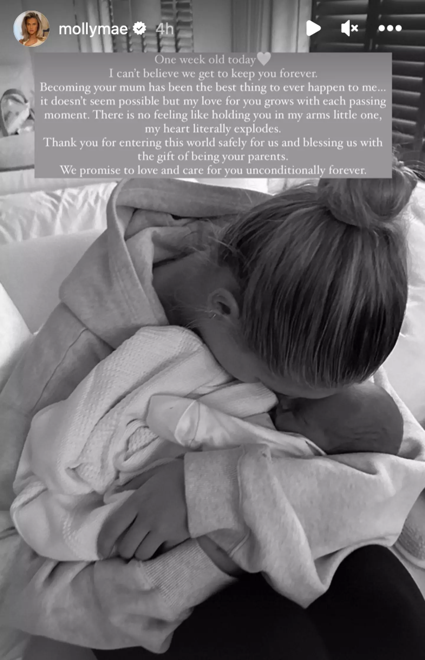 In the black and white pic, Molly-Mae and Tommy sat side by side in the hospital bed while Tommy cradled the newborn baby in his arms.