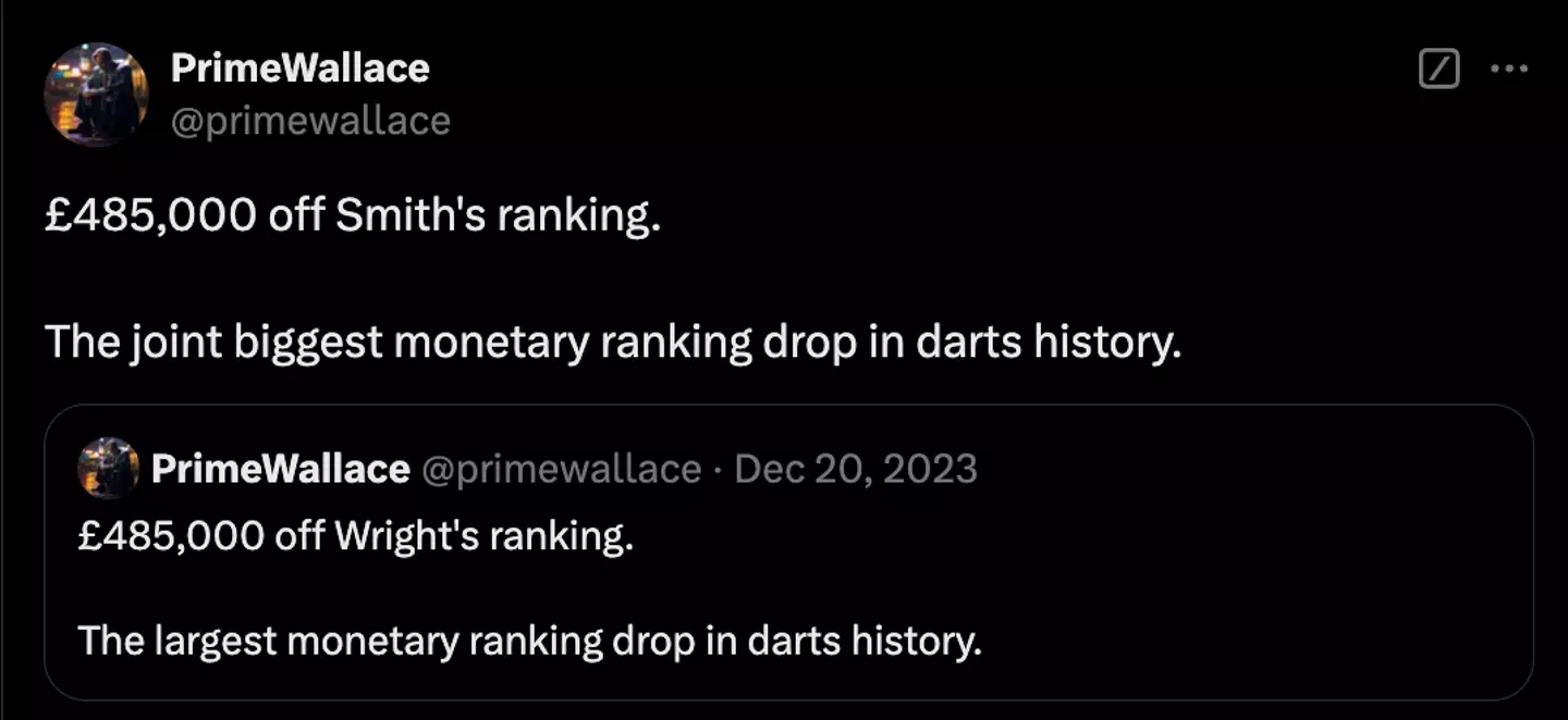 Twitter user @PrimeWallace noted that Smith had dropped £485,000 prize money in one night as a result of his defeat, matching the record set by two-time champion Peter Wright when he lost at the same stage last year.