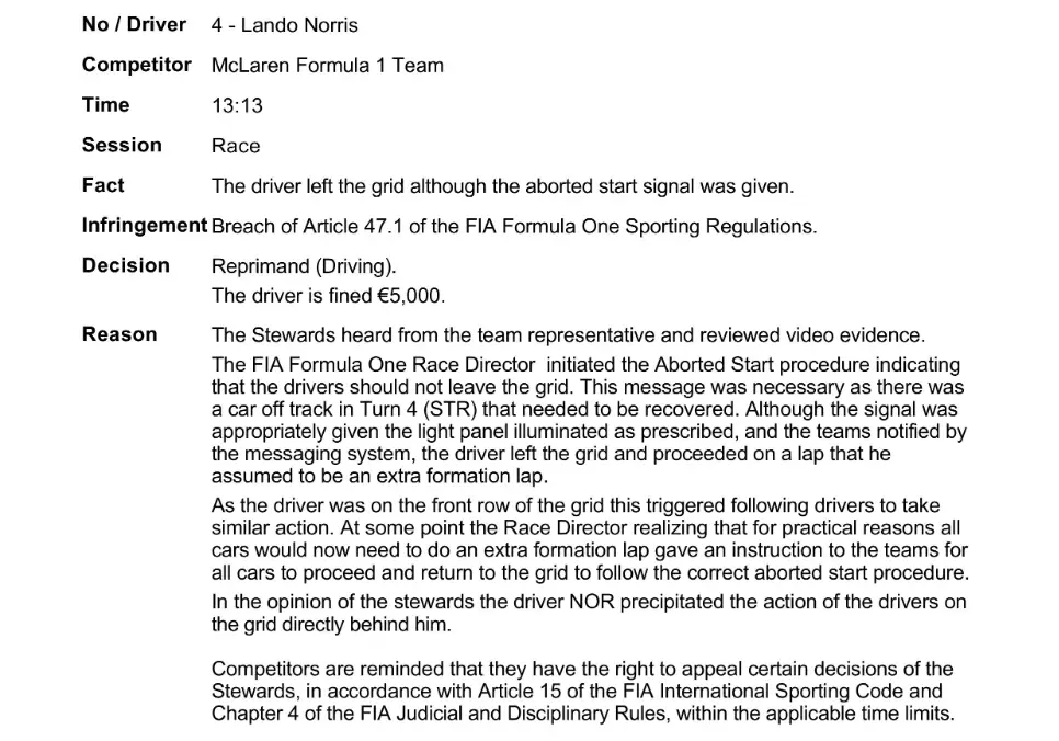 A statement on Norris' punishment reads: "The FIA Formula One Race Director initiated the Aborted Start procedure indicating that the drivers should not leave the grid.