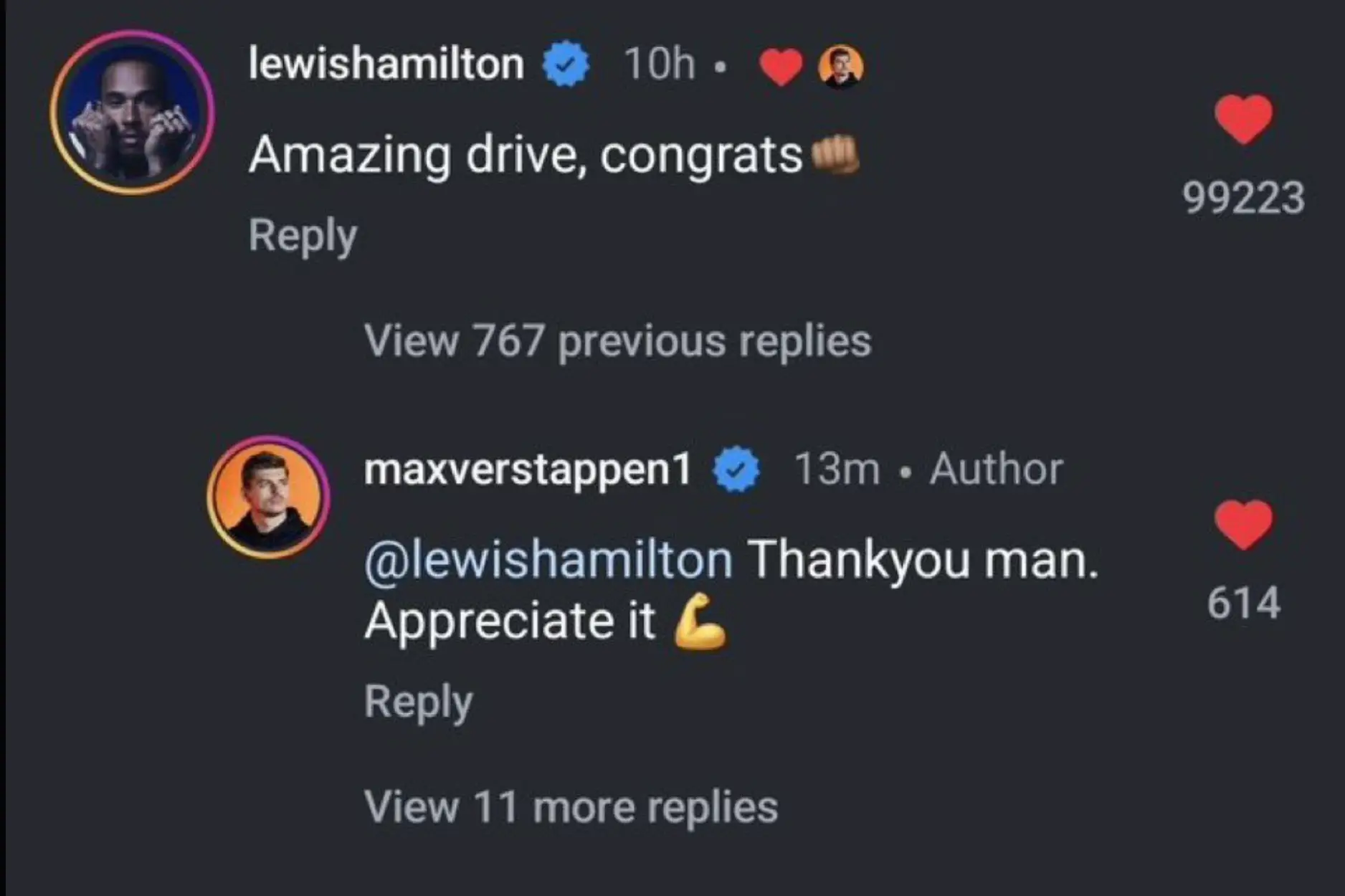 And he also left a comment on his former great rival Verstappen's Instagram post after the race.