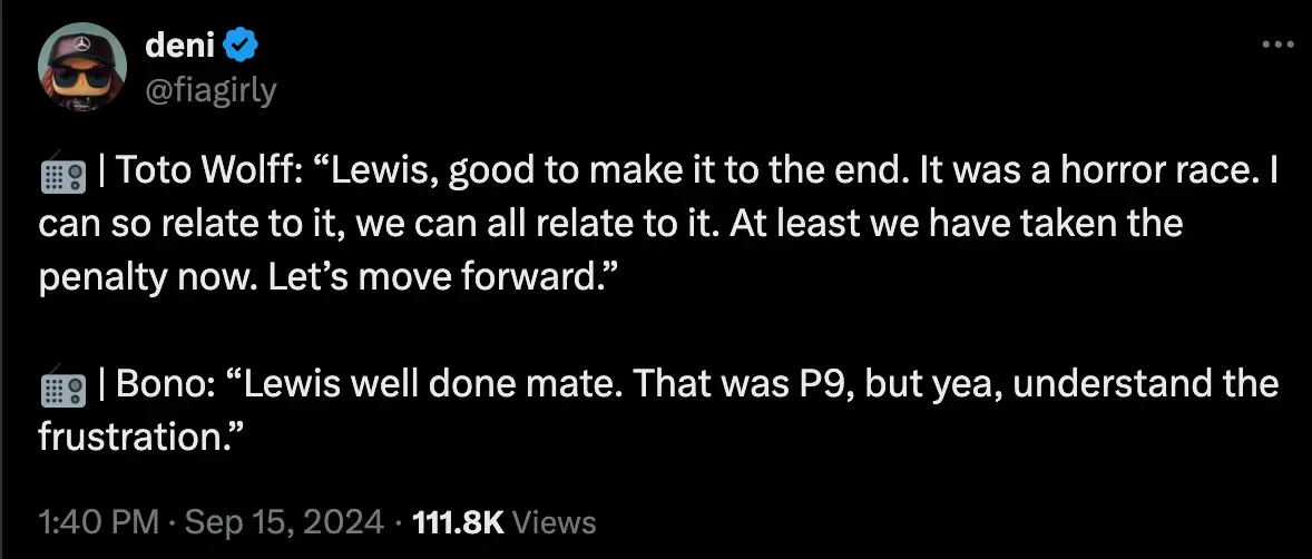 Wolff said: "Lewis, good to make it to the end. It was a horror race. I can so relate to it, we can all relate to it. At least we have taken the penalty now. Let's move forward."
