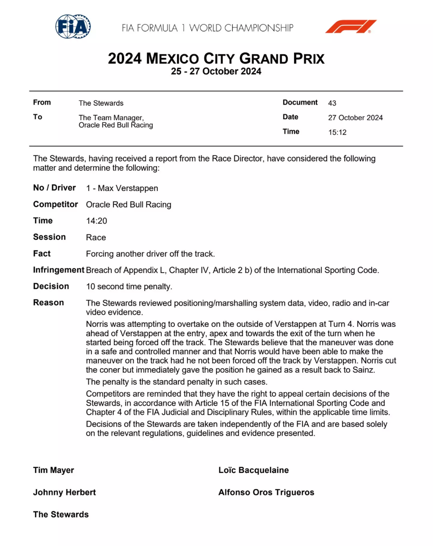 The FIA have given their official reasoning for giving Red Bull's Max Verstappen a 20-second time penalty at the Mexico City Grand Prix.