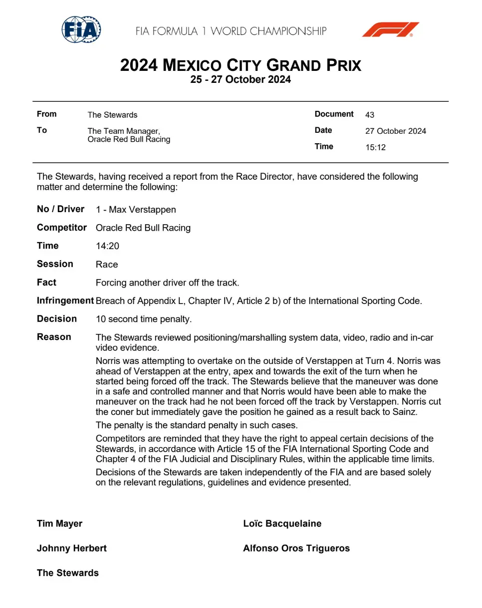 Now, after much debate throughout the Grand Prix and differing reactions from both drivers, the FIA have released two documents which explain the stewards' decision to hand Verstappen a significant penalty.