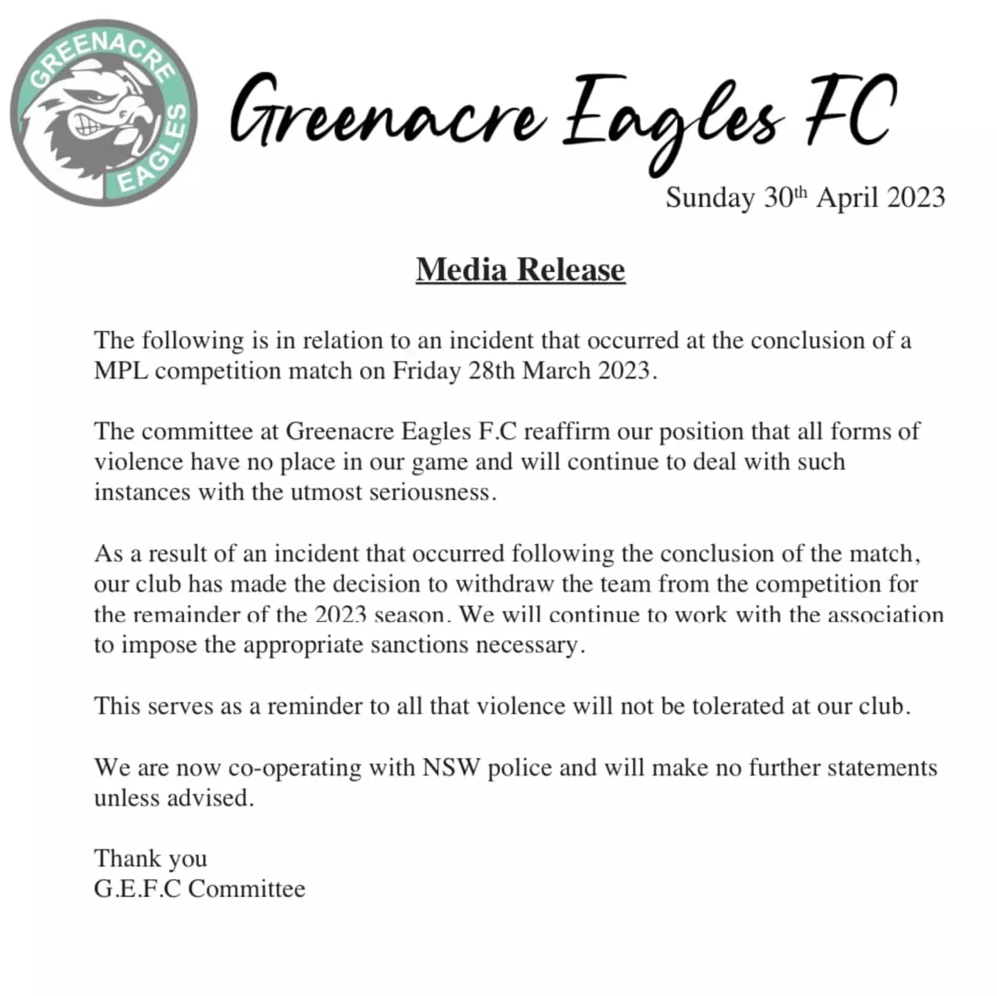 In response to the incident, the Greenacre Eagles sent out a statement condemning any forms of violence.