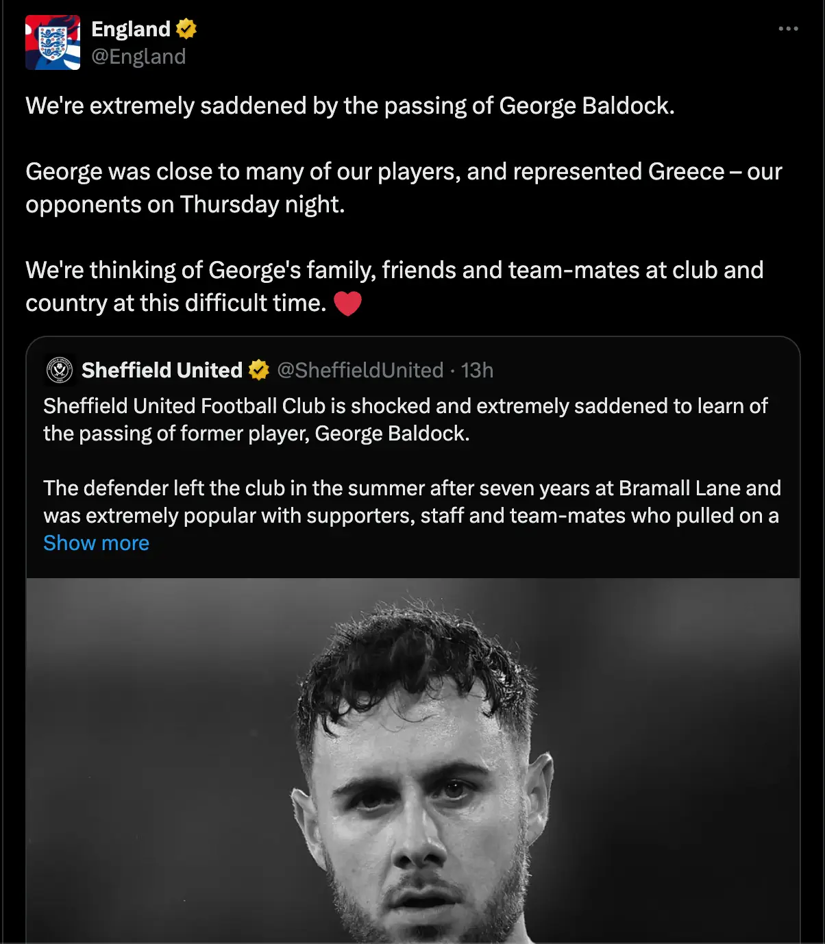 England paid tribute to Baldock after news of his death was announced last night, writing on social media: "We're extremely saddened by the passing of George Baldock.