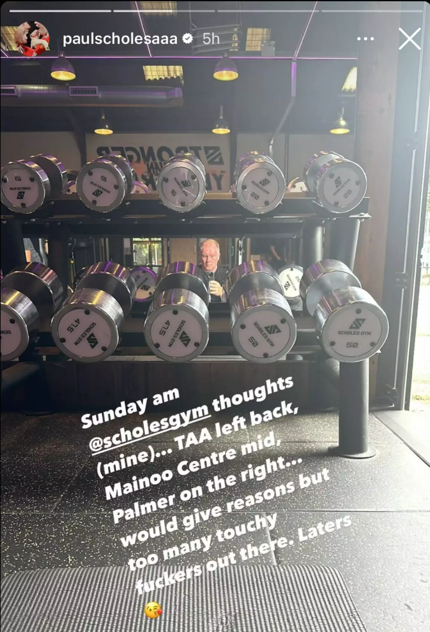 Taking to his Instagram, Scholes wrote: "Sunday am thoughts... TAA left-back, Kobbie Mainoo centre mid, Palmer on the right... would give reasons but too many touchy f***ers out there."
