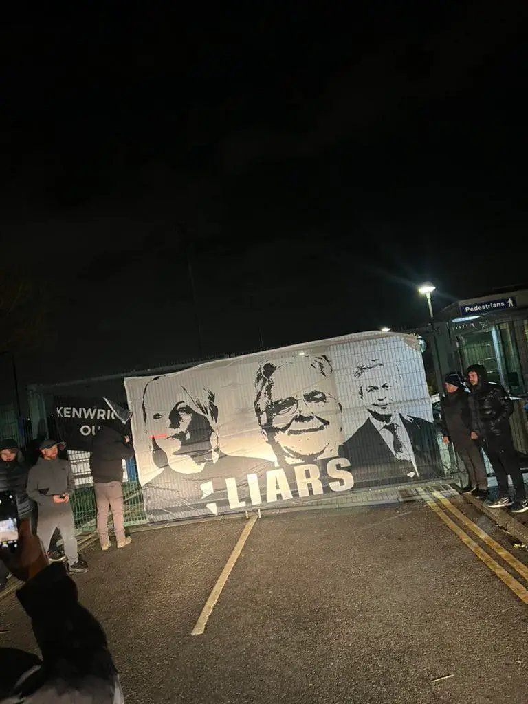 Meanwhile, one flag depicted the images of Moshiri, Kenwright, and CEO Denise Barrett-Baxendale with the word ‘LIARS’ written over it.