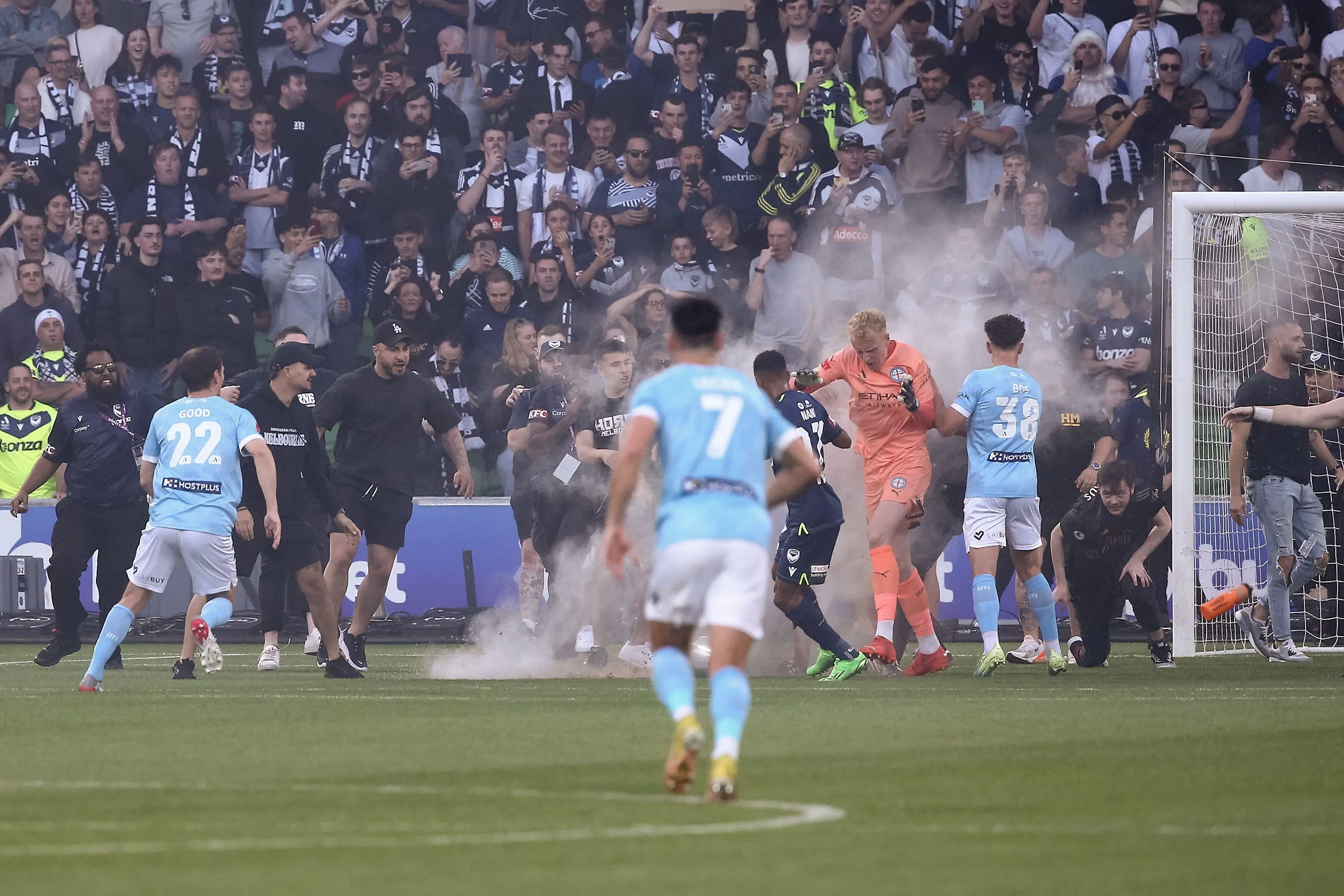 More than 150 Victory fans stormed the field at AAMI Park as their side took on Melbourne City.