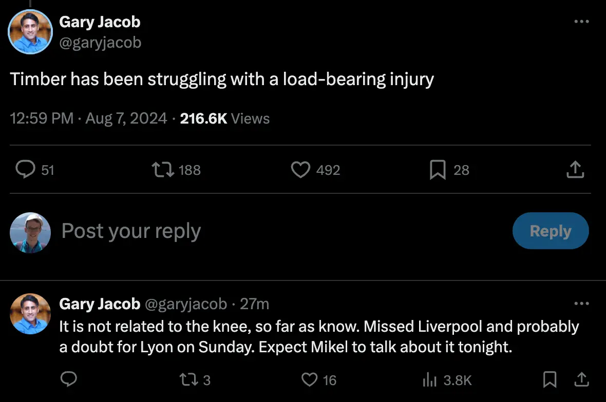 Now, The Times reporter Gary Jacob has confirmed that Timber is suffering from a 'load-bearing' injury, although the belief is that is not related to his previous knee injury.