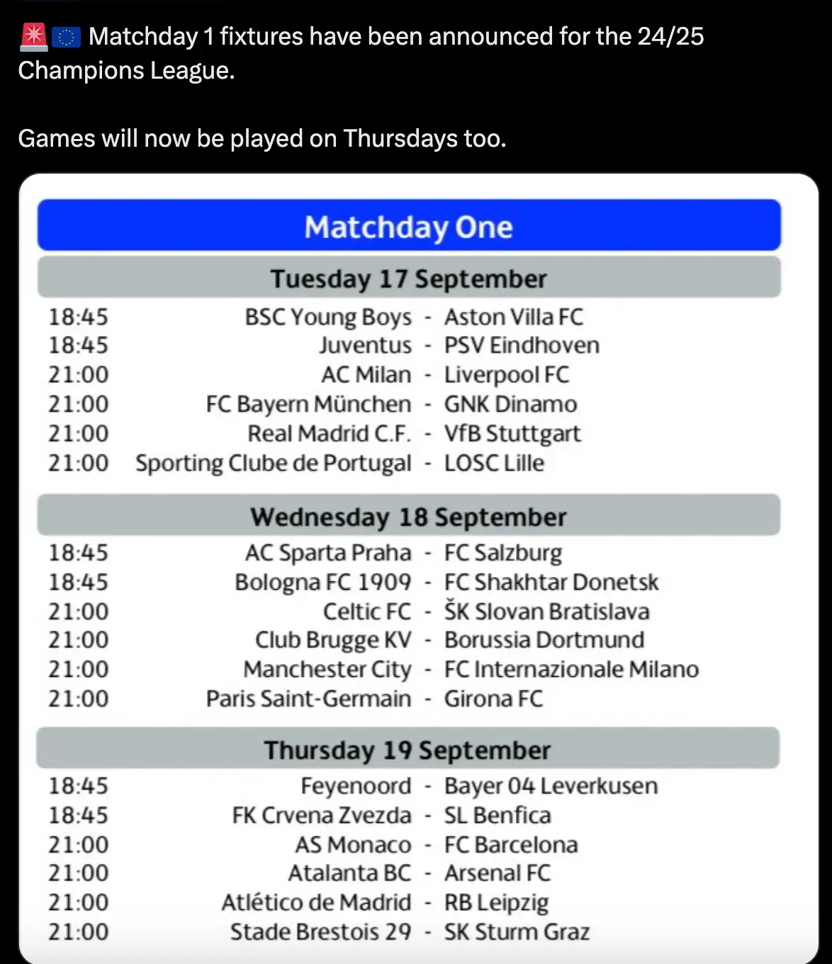 This will only apply to the first matchweek of the league phase, with all the other matchweeks seeing games played on a Tuesday and Wednesday.