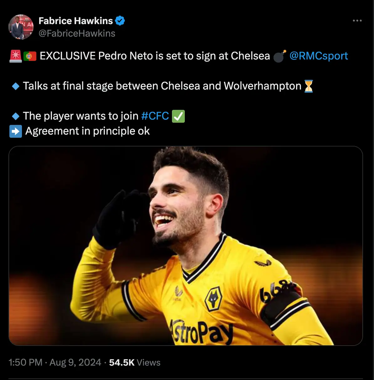 Wolves are said to have rejected lesser offers from Chelsea before settling on the £51.4 million initial fee, with The Athletic adding that Neto is now set to undergo a medical at Cobham before finalising his move.