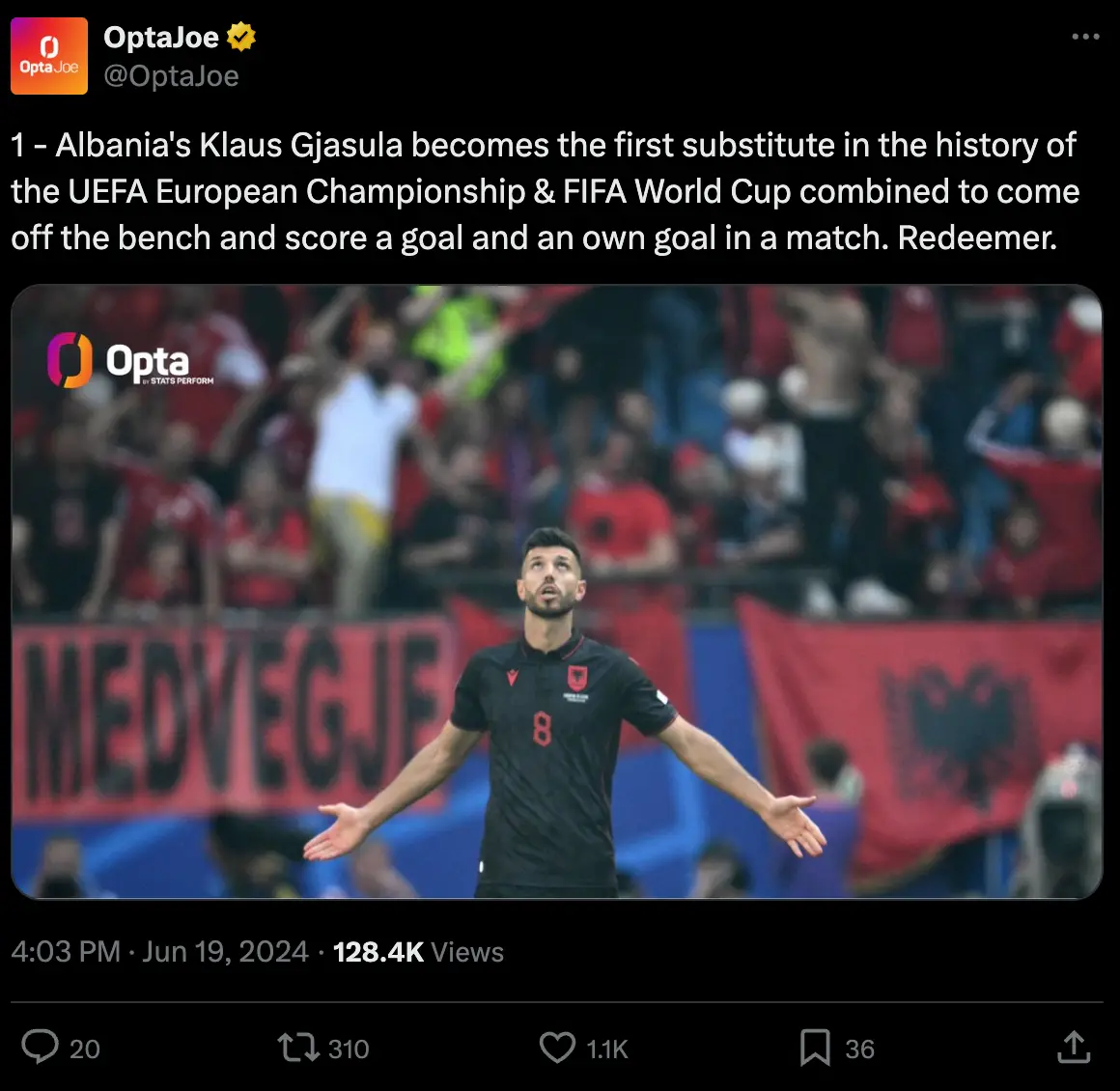 And as per OptaJoe, Gjasula's trio of contributions means he has set a European Championship and World Cup record that may never be matched.