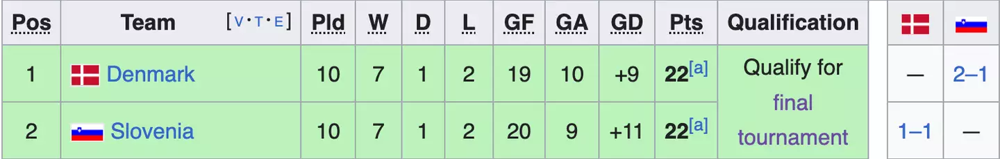 Astonishingly, Denmark and Slovenia were actually drawn in the same qualifying group - and both finished on 22 points.