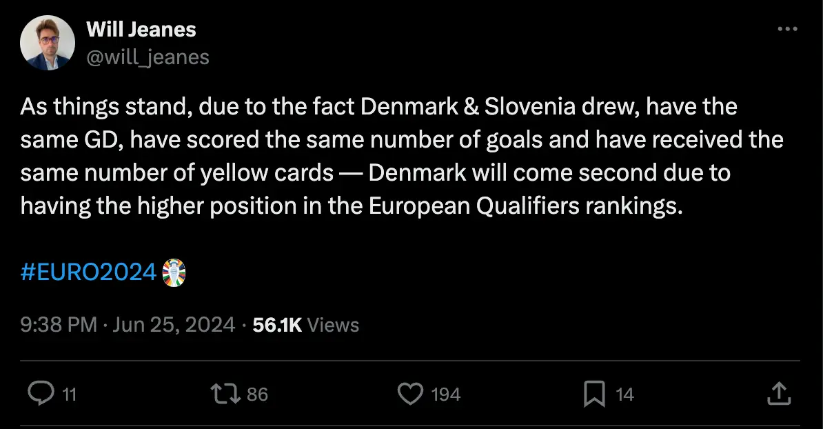 As per journalist Will Jeanes yesterday evening, Denmark finished second only by virtue of their higher position in the European Championship qualifier rankings.