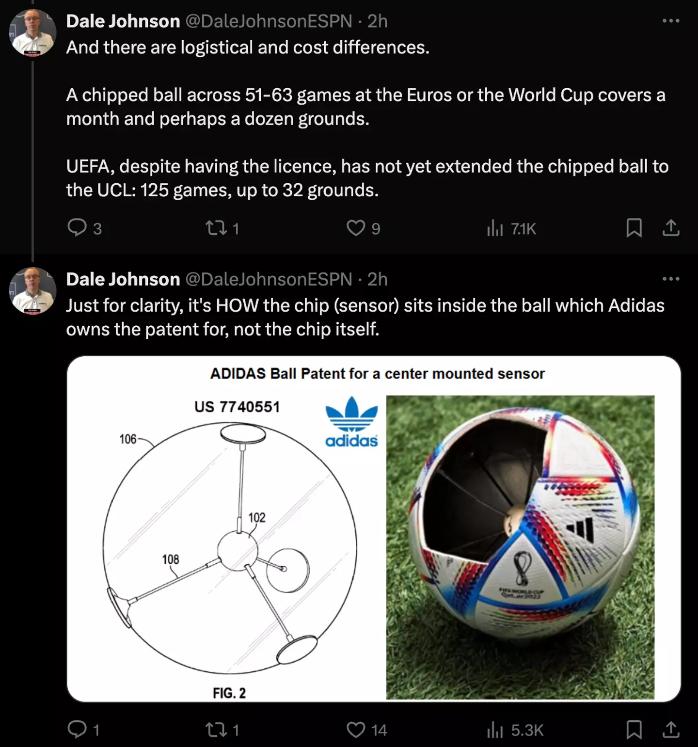 The chip - or the way in which the chip is placed in the ball - is also patented by Adidas, meaning other ball providers would have to create their own version for it to work.