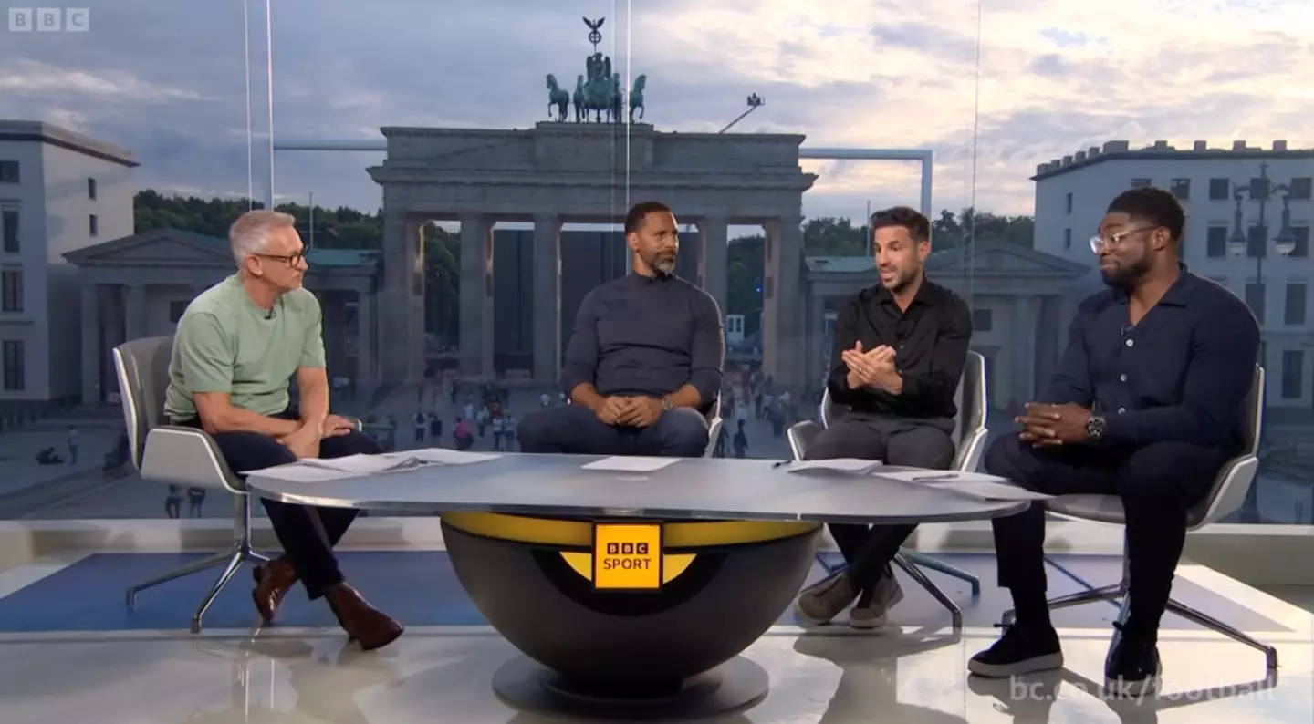 The 63-year-old was sat alongside Cesc Fabregas, Micah Richards and Rio Ferdinand during the action in Gelsenkirchen.