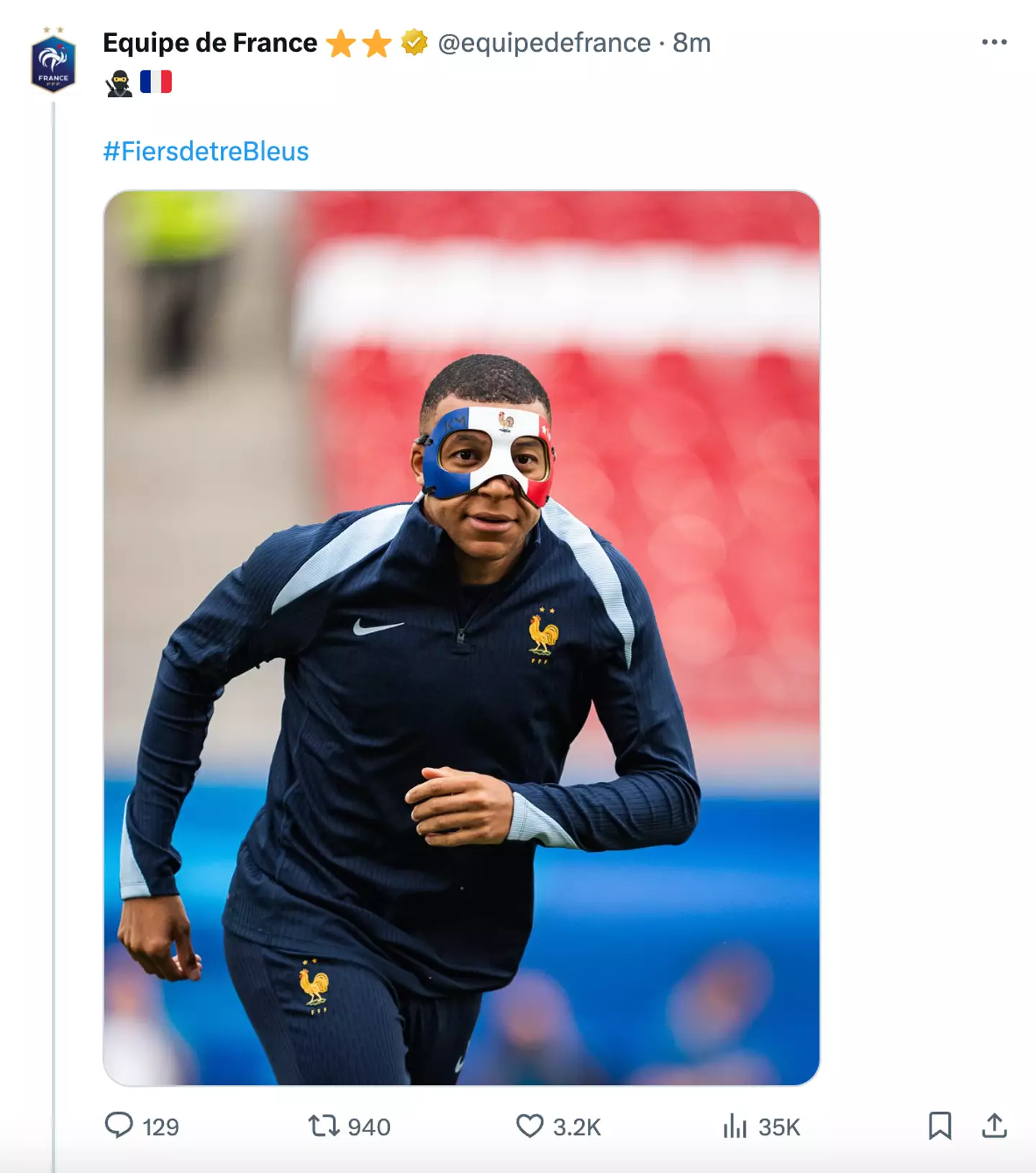 Mbappe has only briefly commented on his broken nose on social media, jokingly asking fans for suggestions for a mask to wear for the remainder of Euro 2024.