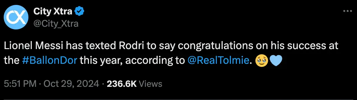 According to Twitter account @RealTolmie, Messi texted Rodri to congratulate him on his success shortly after the midfielder had namedropped him in his acceptance speech.