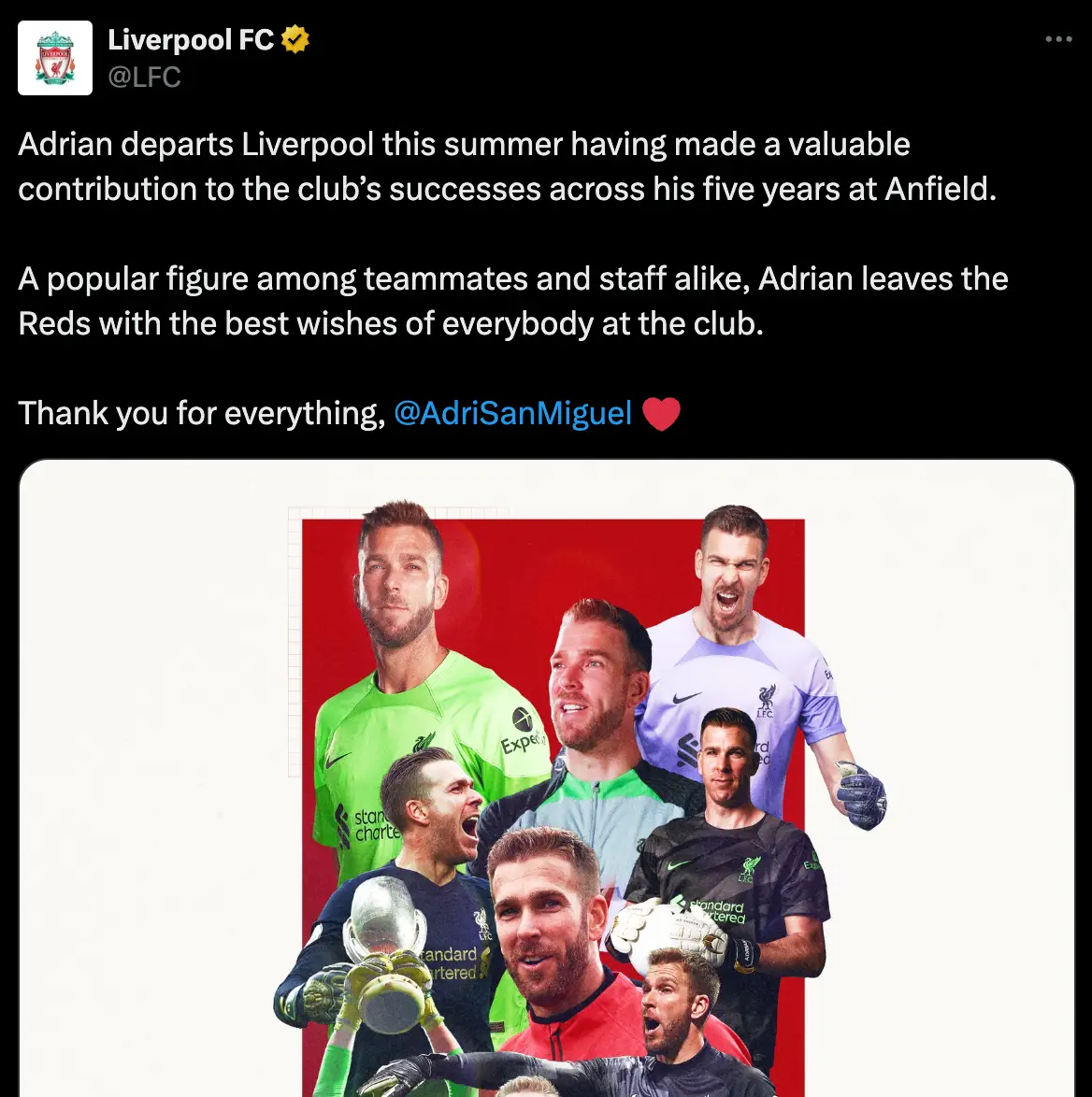 In a club statement, Liverpool wrote: "Adrian departs Liverpool this summer having made a valuable contribution to the club's successes across his five years at Anfield.