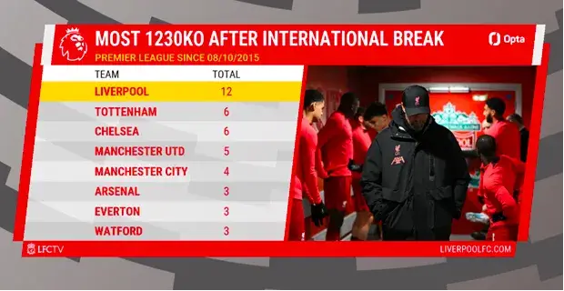 But it is no surprise Klopp feels somewhat aggrieved, with Liverpool having played at 12:30 on Saturday more than double the amount as any other side in the top-flight.