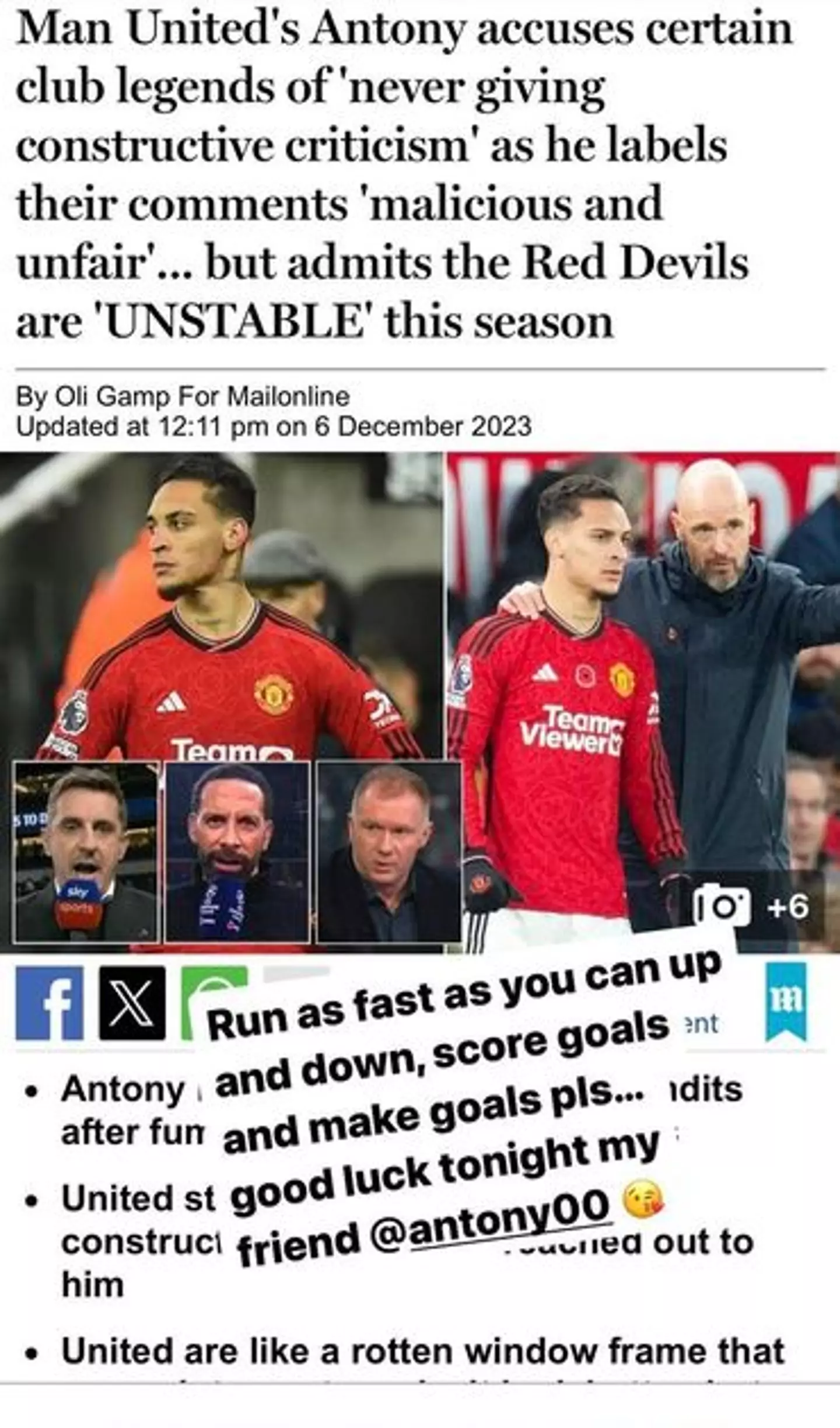 Reposting an article about Antony's interview, the former England international jokingly wrote on his story: "Run as fast as you can up and down, score goals and make goals pls.. good luck tonight my friend @Antony00," accompanied by a kissing emoji.