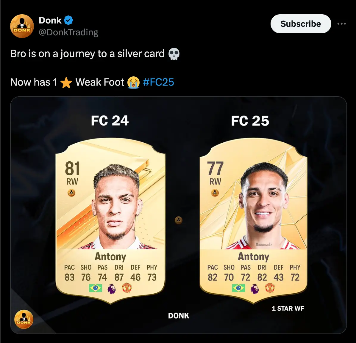Now, Antony has received a significant downgrade to his Ultimate Team card for EA FC 25.