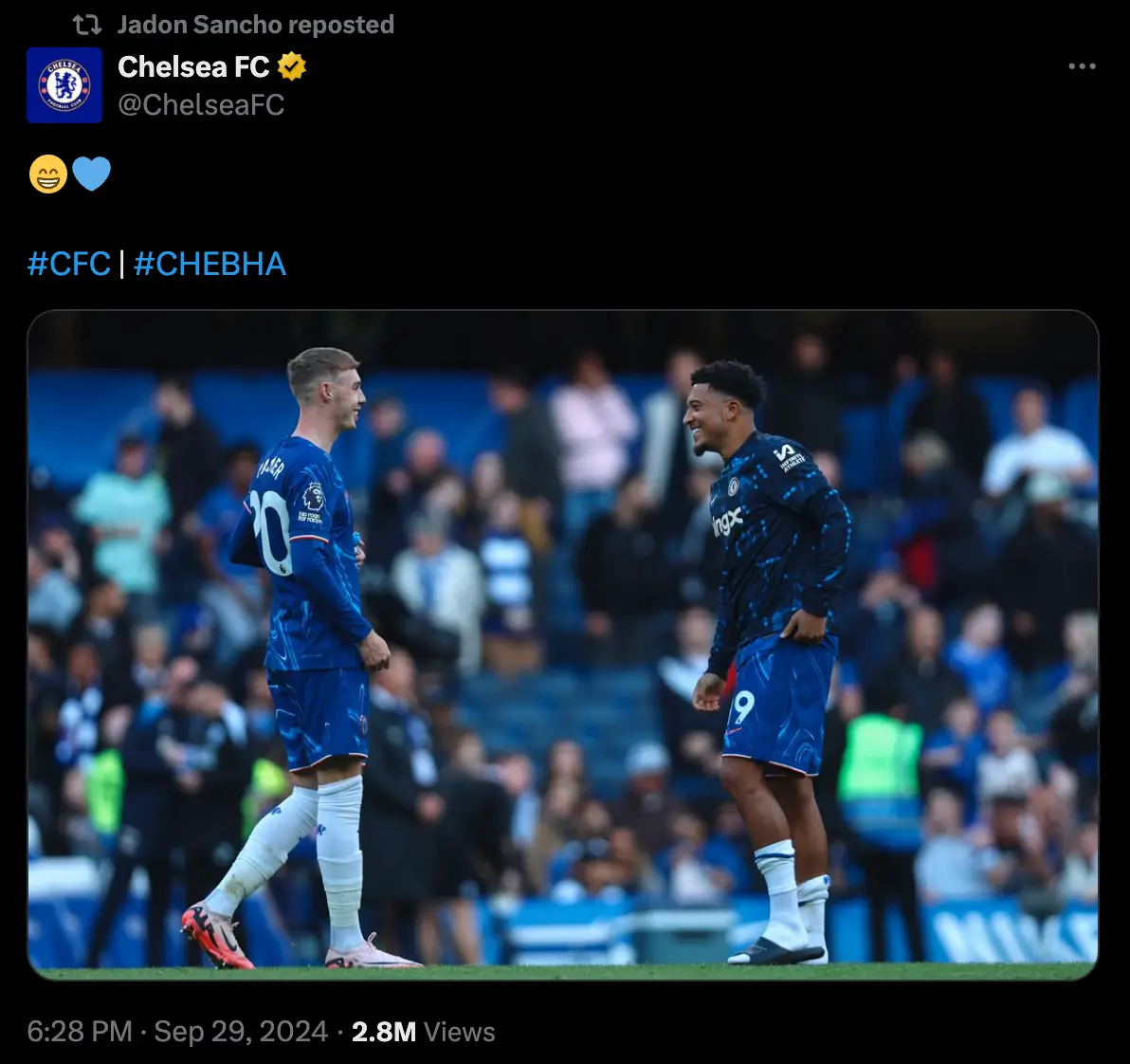 Just moments after United's 3-0 defeat to Tottenham, Chelsea's official Twitter account posted a photo of Sancho and Cole Palmer appearing in high spirits after their side's 4-2 win over Brighton on Saturday.