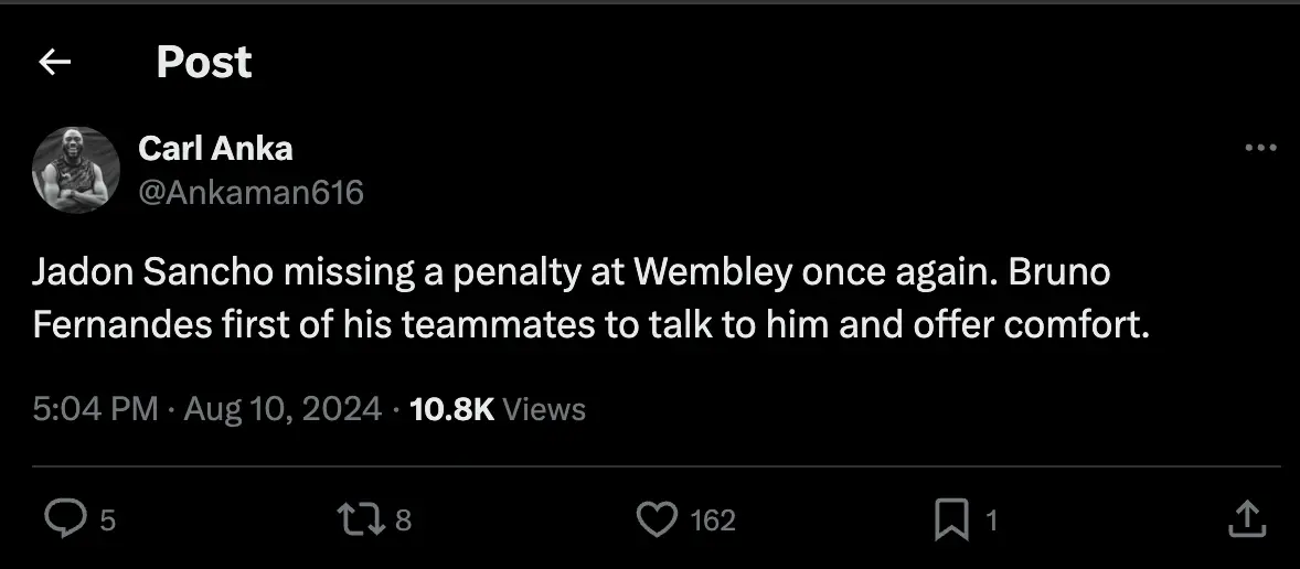 The Athletic reporter Carl Anka noted that one player walked straight over to Sancho to console him - captain Bruno Fernandes.