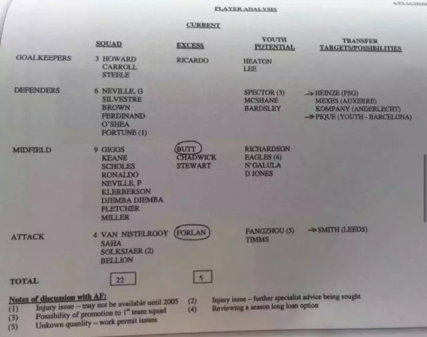The 'excess' column contained the likes of Diego Forlan and Nicky Butt, who were both circled.