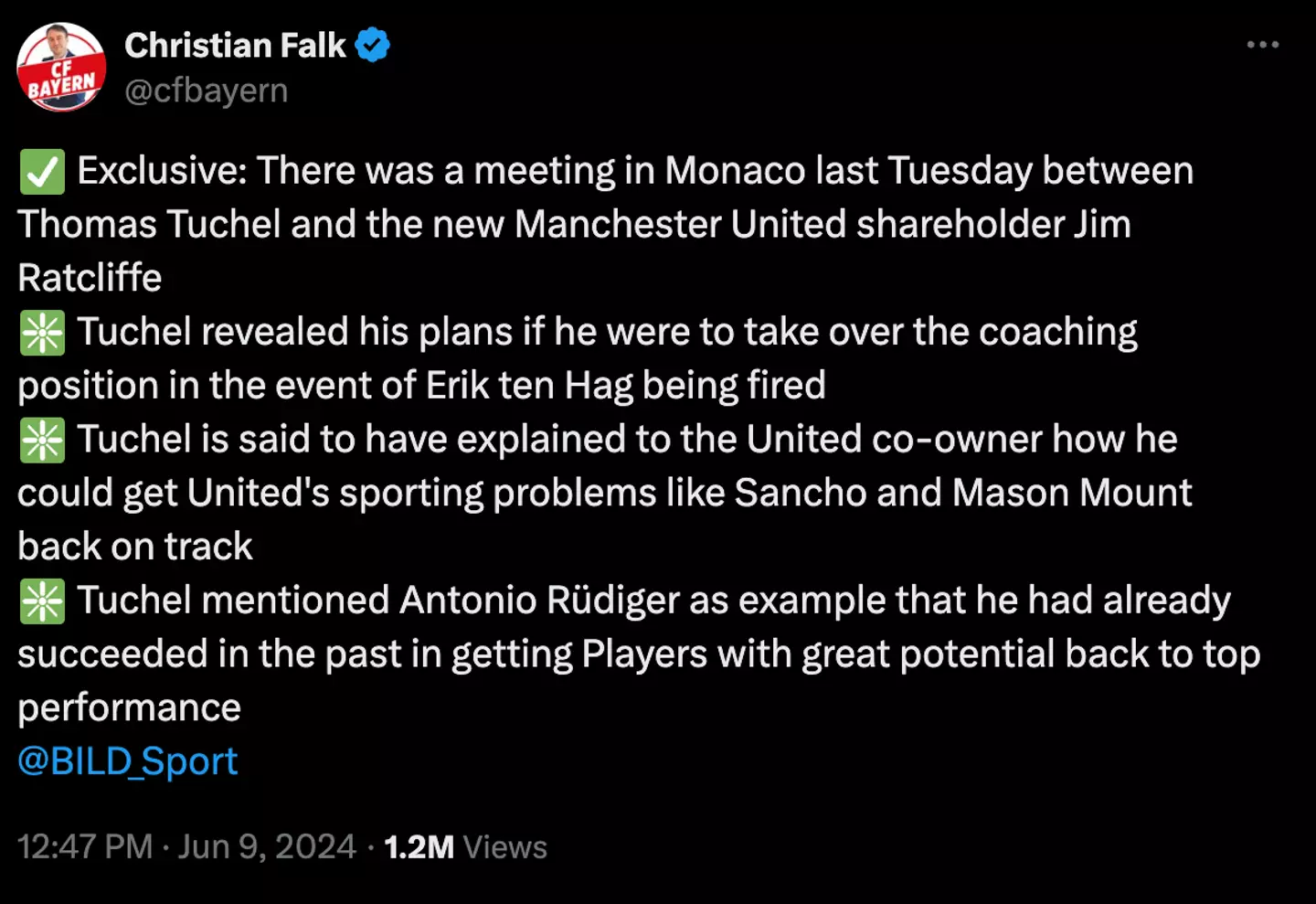 "Tuchel currently decided not to continue in talks with United after meeting in recent weeks. United, deciding on Erik ten Hag future soon."