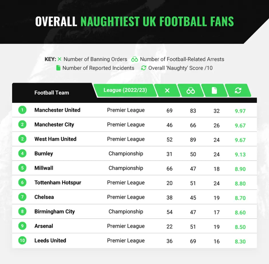 Using data including banning orders, football-related arrests and reported incidents, each club has been given an overall 'naughty' score.