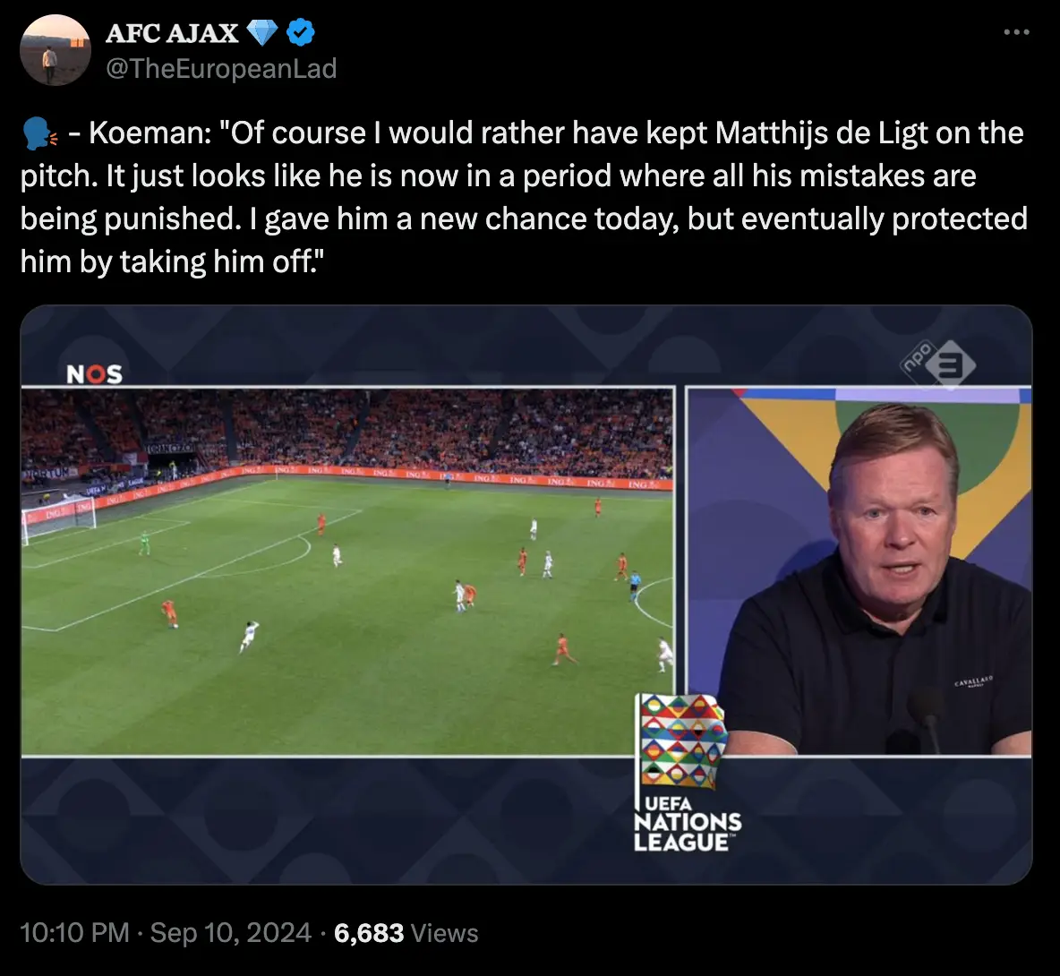 Netherlands manager Ronald Koeman has spoken out on his decision to substitute Matthijs de Ligt at half-time during his side's 2-2 draw against Germany in the Nations League.