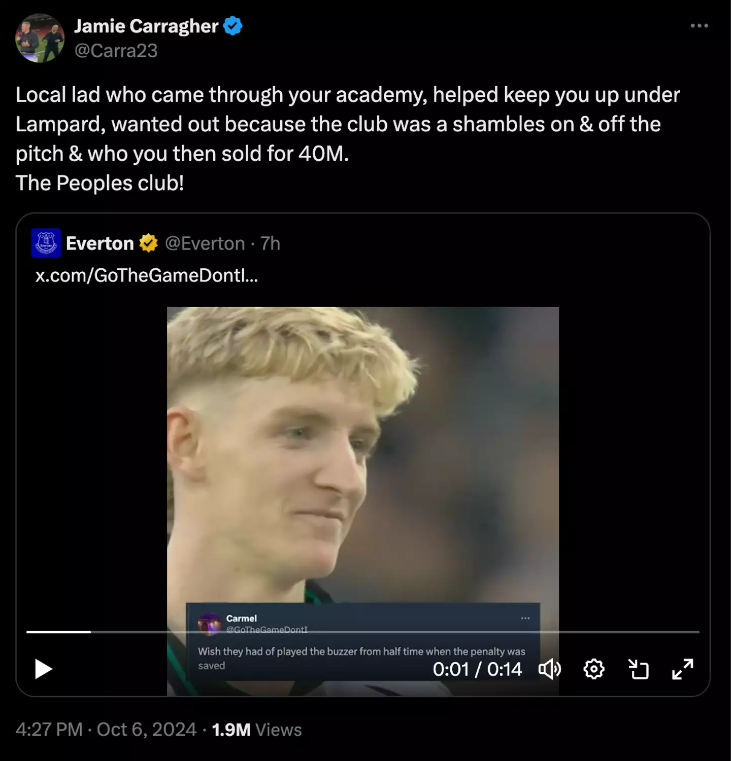 The now Sky Sports pundit and Anfield legend has taken a dim view of Everton mocking one of their former academy products who they obtained a decent sized transfer fee for and had legitimate reasons for wanted to move on to pastures new as he slammed the post.